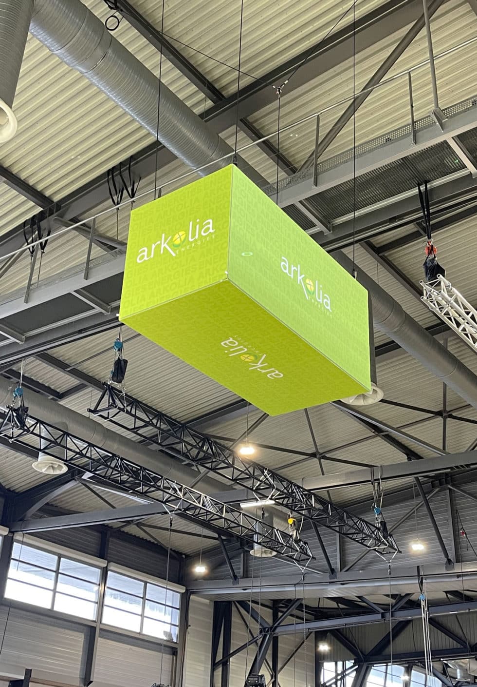 - Des formes au choix : Personnalisez la forme de votre enseigne en fonction du design de votre stand. Optez pour une enseigne élinguée cubique ou rectangulaire pour une présentation qui correspond à votre identité visuelle.